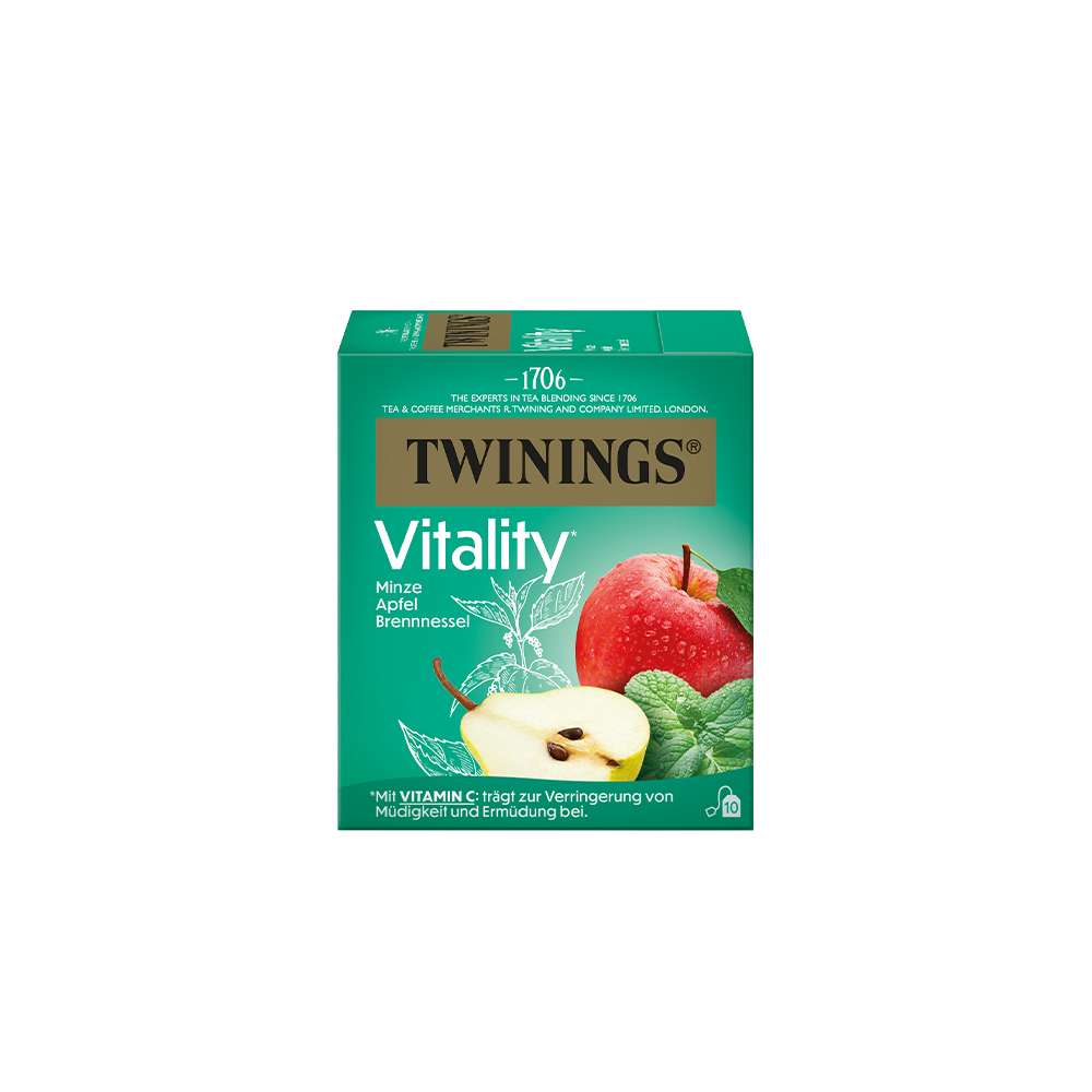 Osvěžující bylinný čaj Twinings Vitality 10×2 g nabízí dokonale vyváženou směs máty, peprminty, jablečných a hruškových tónů s přídavkem vitamínu C pro podporu vitality a snížení únavy.