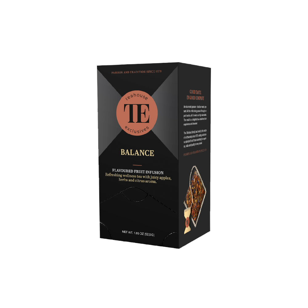 Teahouse Exclusives Balance – Osvěžující wellness čaj s vůní jablka, bylinek a citrusů. Dokonalá rovnováha chutí pro relaxaci i povzbuzení. Luxusní balení, skvělý dárek. Užijte si chvíle harmonie každý den!