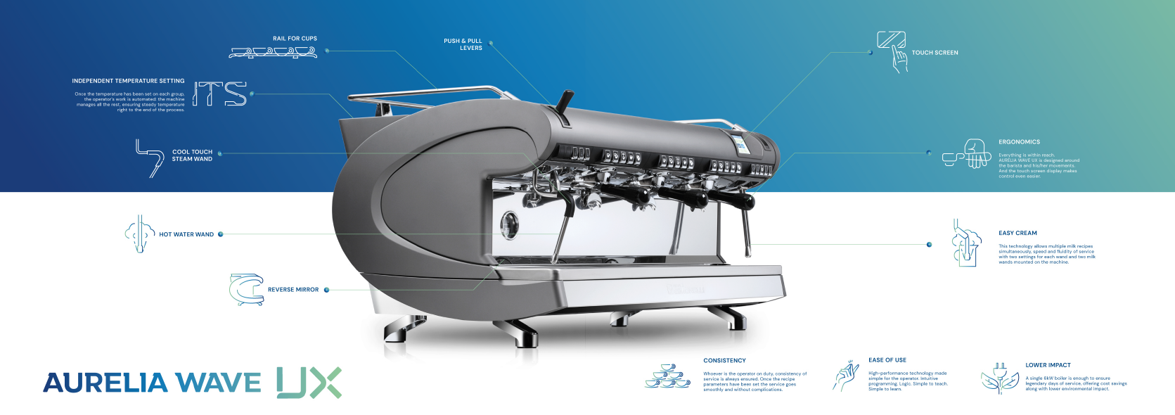 Technologie ITS - Nový systém na ohřívání bojleru s použitím termostatického směšovače a vyhřívaných hlav kávovaru umožní nastavit různou teplotu pro každou hlavu kávovaru zvlášť s nízkou energetickou náročností. Barista si teplotu každé hlavy kávovaru nastaví elektronicky na displeji kávovaru Nuova Simonelli Wave UX. Tento systém je zaměřen především na přípravu nejširšího spektra kávy.