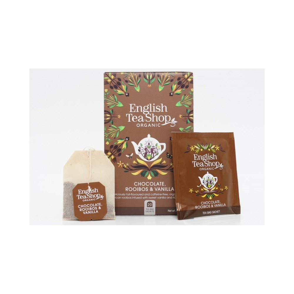 Složení: bio rooibos 88.5%, bio kousky kakaa 6%, přírodní příchuť 5%, bio vanilkové lusky 0.5%.